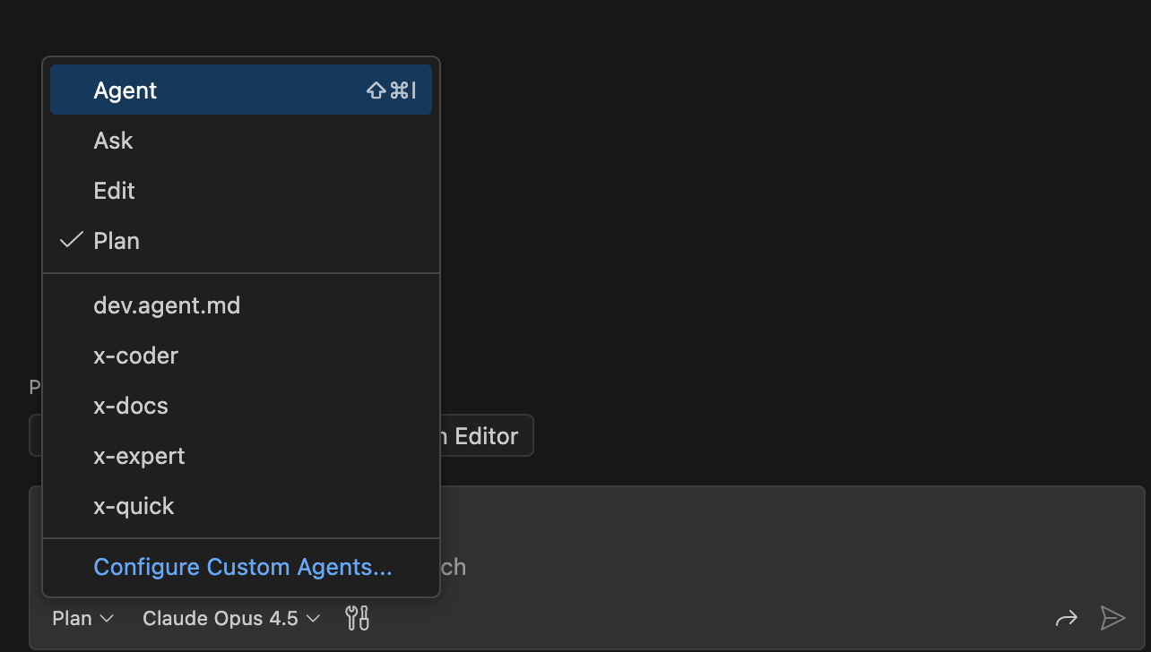 💡 İpucu: "Configure Custom Agents..." seçeneğine tıklayarak mevcut agent'larınızı düzenleyebilir veya yenilerini ekleyebilirsiniz.