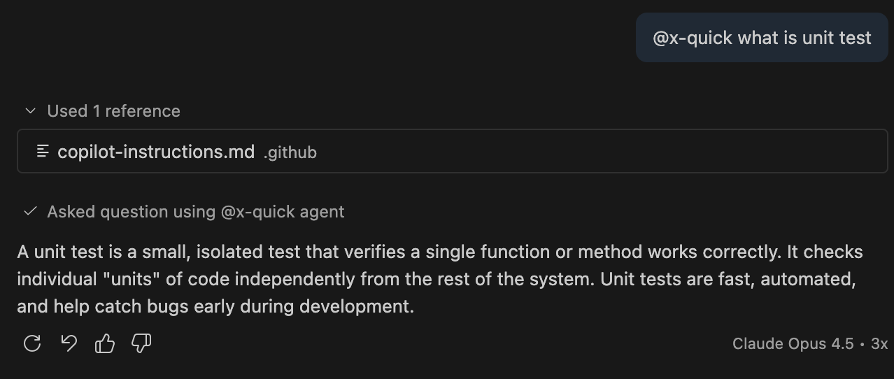 @x-quick what is unit test yazdığınızda, agent kısa ve öz cevap veriyor: